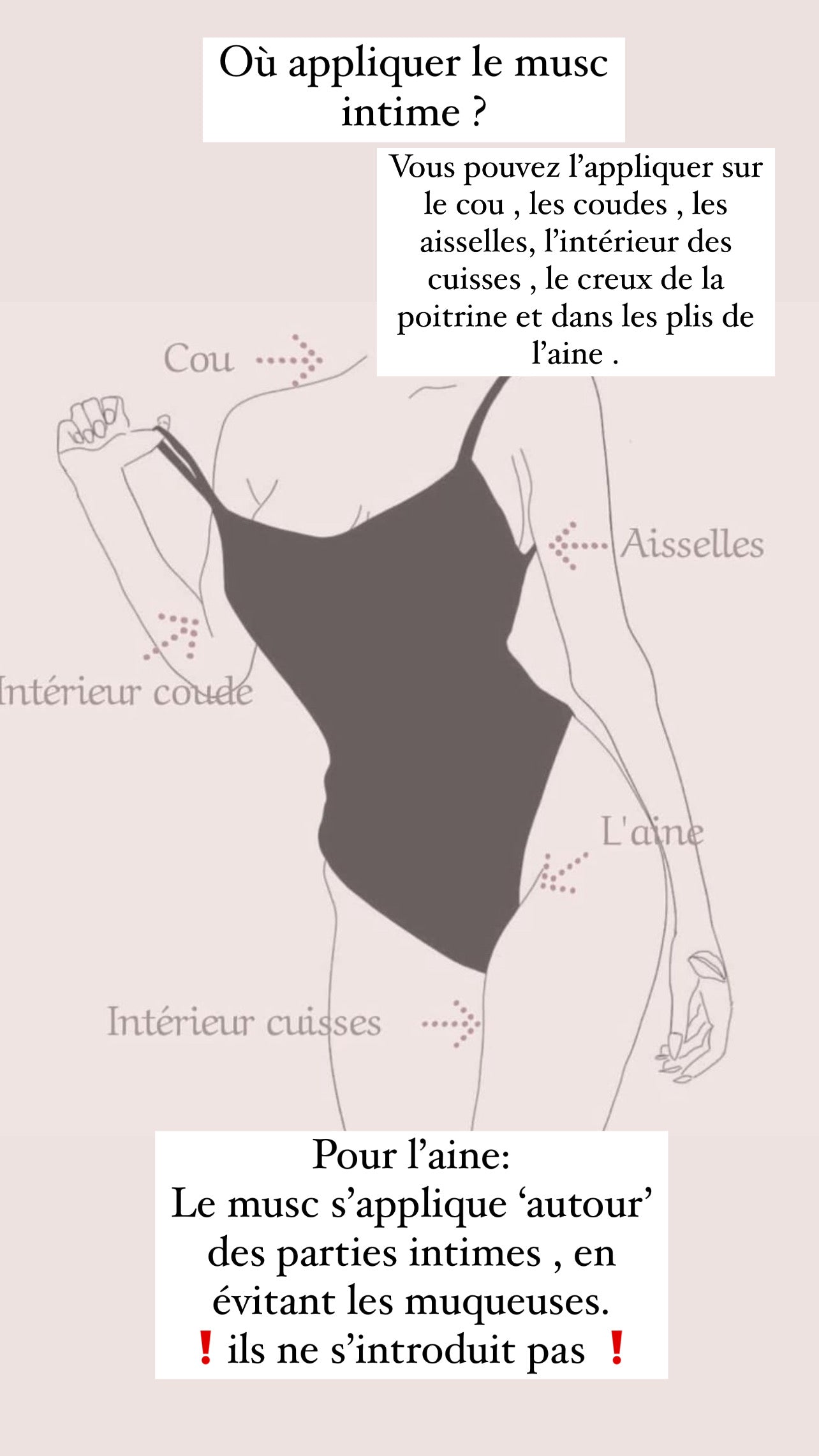 Le musc intime s’applique dans les plis de l’aine (autour des parties intimes voir schéma photo n2 ) et peut également être utilisé sur les zones chaudes du corps : nuque, cou, poignets, l’intérieur des coudes et le creux de la poitrine (entre les seins).